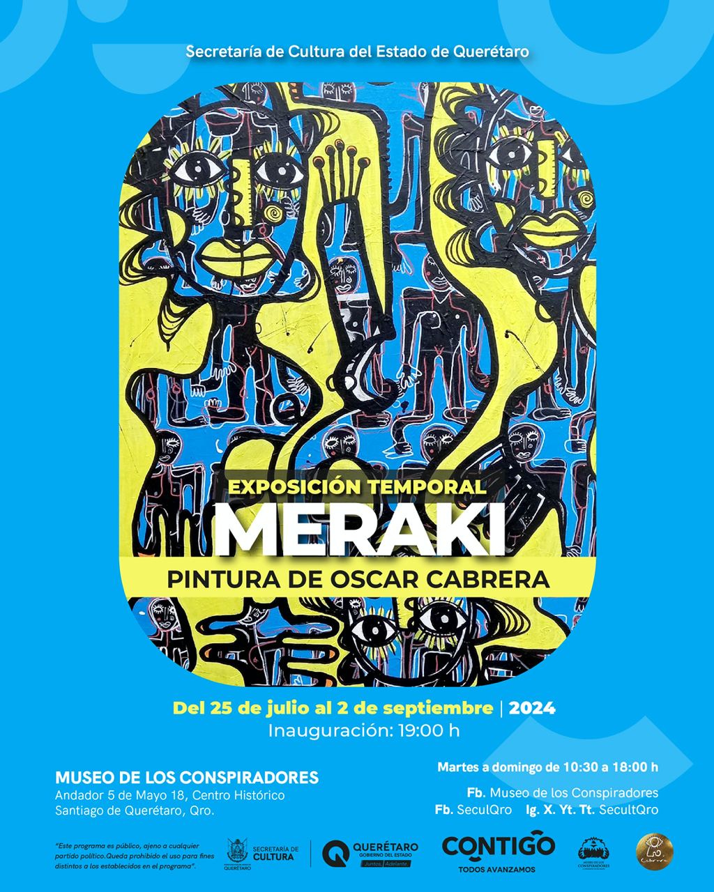 En el Museo de los Conspiradores, de la Secretaría de Cultura del estado, el pintor queretano Óscar Cabrera Guerrero inaugurará este jueves 25 de julio su exposición “Meraki”, en la que las emociones crean historias y personajes espontáneos e inesperados con una esencia y presencia trascendida.