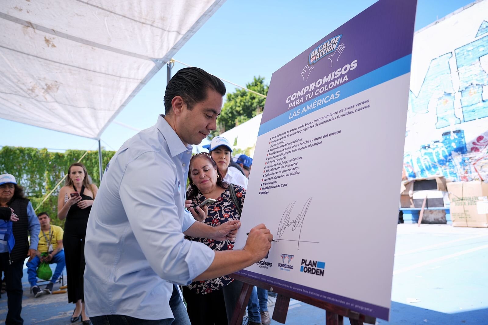 Como parte de los esfuerzos para dignificar y mejorar las condiciones de vida de las familias queretanas, el presidente municipal de Querétaro, Felifer Macías, dio inicio a los trabajos de rehabilitación y mejoramiento de la imagen urbana en la colonia Las Américas I, y durante el recorrido, firmó un acuerdo para comenzar de inmediato las acciones en los espacios públicos y anunció una inversión de dos millones de pesos para mejorar la infraestructura de la cancha deportiva y en la zona.