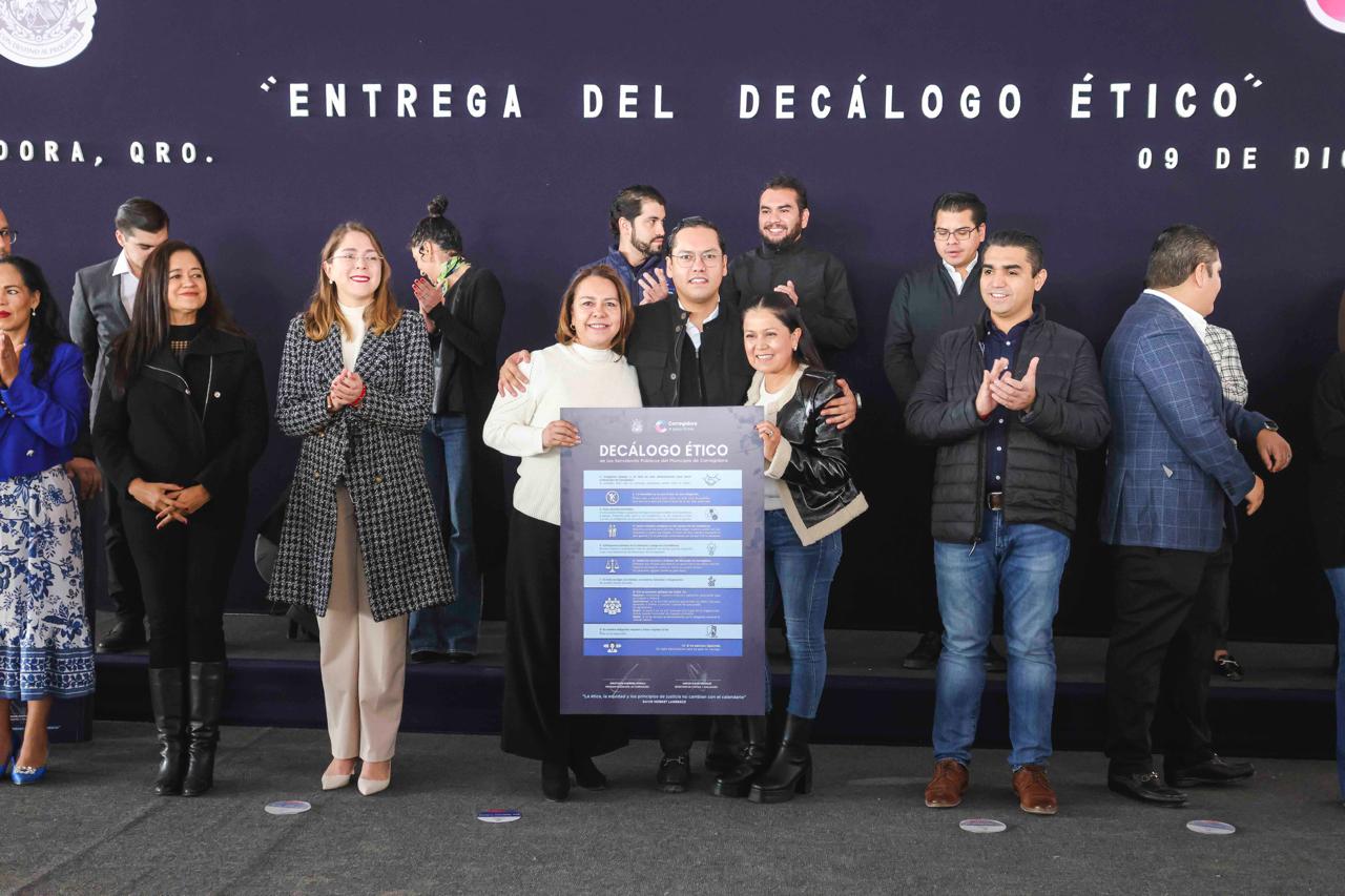 El presidente municipal de Corregidora, Chepe Guerrero, entregó el Decálogo Ético al gabinete legal y ampliado de la administración de Corregidora, el cual debe ser seguido por las y los servidores públicos de la demarcación. En el se promueven principios como trabajo, honradez, empatía, constancia, respeto, atención inmediata a la ciudadanía, solución de problemas y el uso responsable de los recursos públicos.