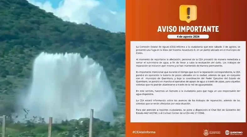 “Es importante mencionar que durante el tiempo que dure la reparación correspondiente, la CEA pondrá en operación la batería de pozos ubicados en la ciudad, además de que, en conjunto con el municipio de Querétaro, y bajo la coordinación del Poder Ejecutivo del Estado de Querétaro, se pondrá en marcha el operativo de apoyo de agua a través de pipas, para aquellas colonias que no podrán abastecerse a través de la red de agua potable”, indicó el comunicado.